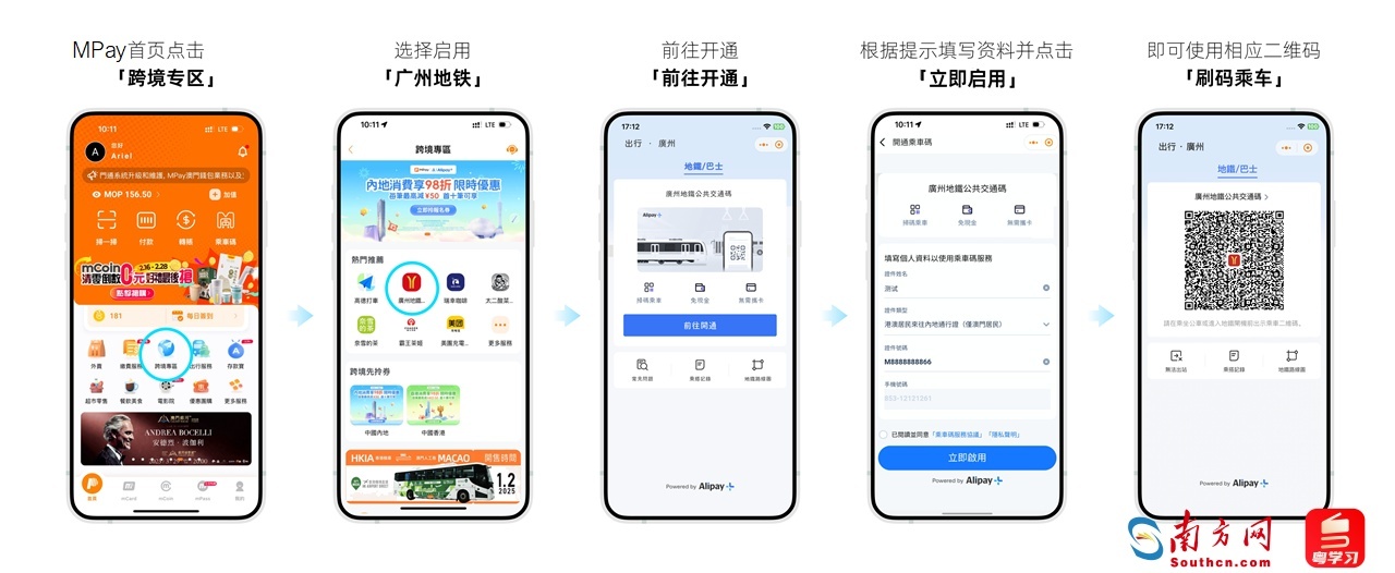 4月2日起,澳门居民使用MPay(澳门电子钱包)上的广州地铁乘车码就能在广州搭乘公共交通,包括广州地铁、公交车、有轨电车、水上巴士以及佛山地铁。MPay成为继AlipayHK(香港电子钱包)后第二个在穗可直接扫码乘车的境外电子钱包。至此,广州成为内地首个支持粤港澳三地跨境电子钱包互联互通的城市,让粤港澳“智慧生活圈”更便捷。